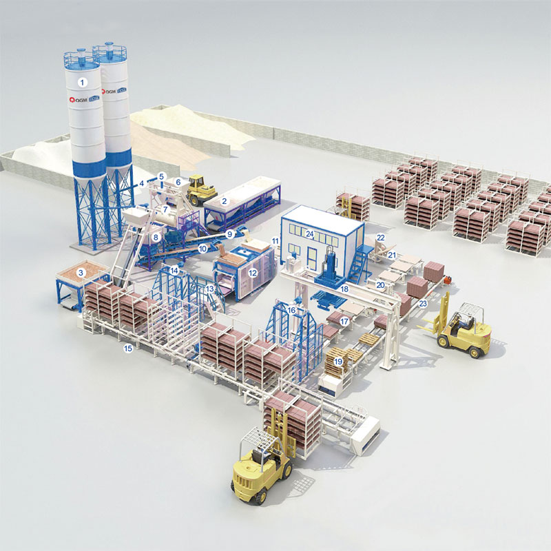 यह स्टील क्योरिंग रैक के साथ एक पूर्णतः स्वचालन उत्पादन लाइन है जो क्योरिंग रैक से सुसज्जित है। लाइन में एक स्वचालित कंक्रीट वजन प्रणाली, एक कंक्रीट मिश्रण स्टेशन, मिश्रण से पहले स्वचालित सीमेंट और अन्य कच्चे माल की आपूर्ति, एक स्वचालित खोखला ब्लॉक बनाने वाली इकाई, एक उठाने वाला उपकरण, गीले ब्लॉक और इलाज ब्लॉक के लिए एक संदेश प्रणाली, एक स्वचालित स्टैकिंग डिवाइस शामिल है। एक पैलेट पुनर्प्राप्ति प्रणाली, और ब्लॉकों को ठीक करने के लिए एक पैकेजिंग प्रणाली। इस लाइन को संचालित करने के लिए केवल 5 कर्मचारियों की आवश्यकता होती है, जो कंक्रीट ब्लॉक, खोखले बिल्डिंग ब्लॉक, कंक्रीट ईंटें और पेविंग ब्लॉक जैसे उत्पाद तैयार कर सकते हैं।